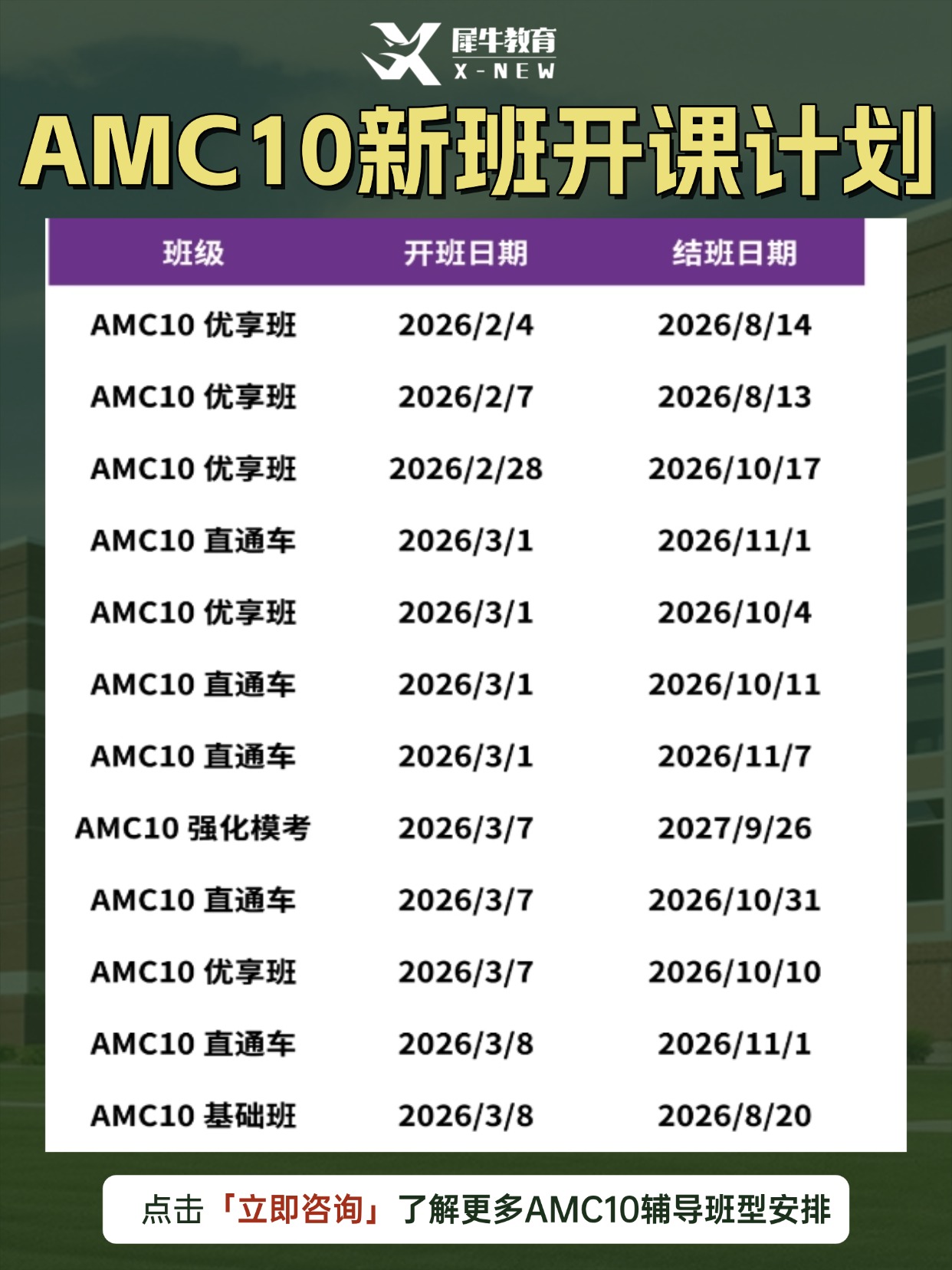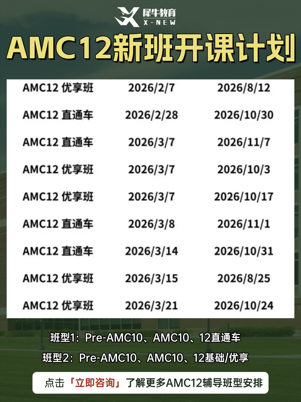 坐标杭州, 犀牛教育针对AMC8,AMC10,AMC12开设了不同的课程安排,包括基础班,强化班,冲刺班,以及全程班
